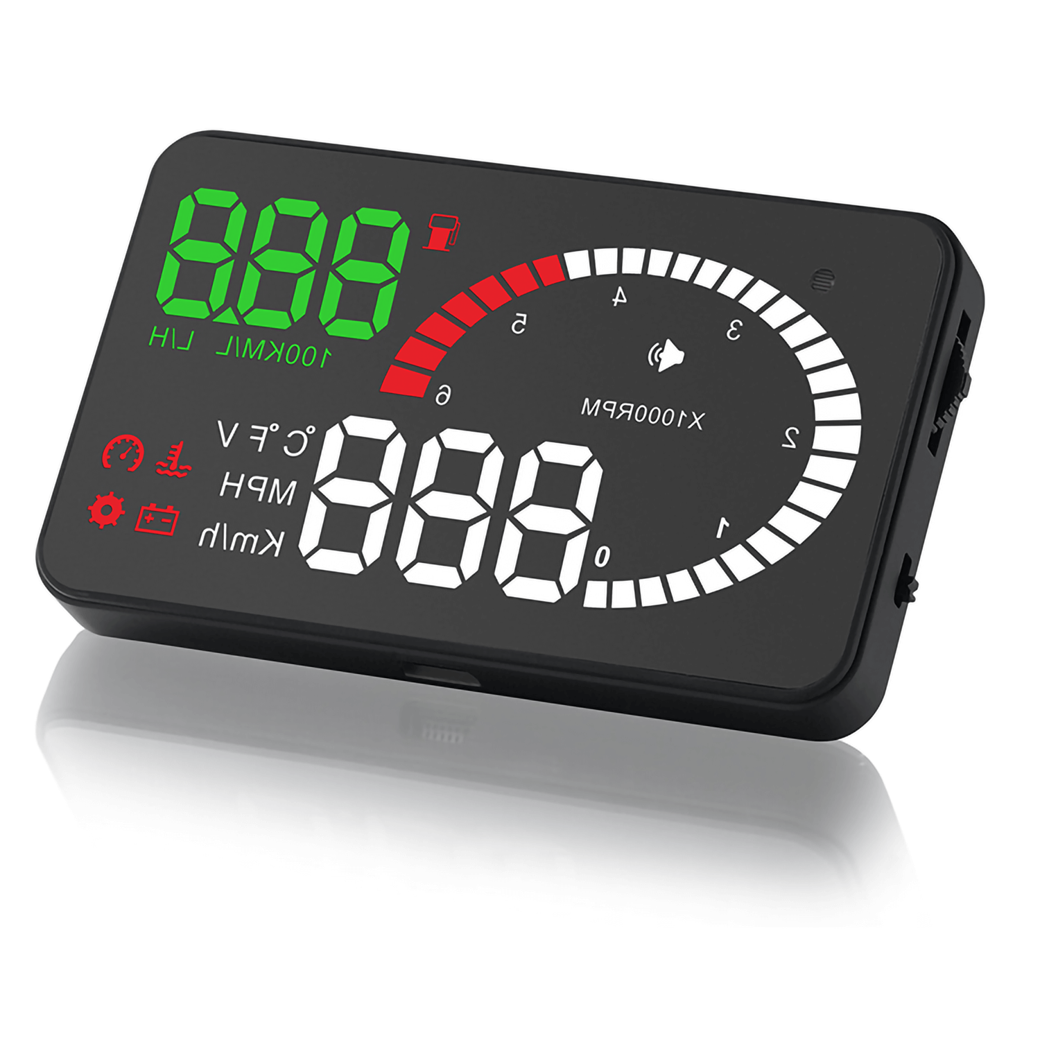 Цифровое многофункциональное устройство для отображения значения скорости и других параметров автомобиля на ветровое стекло возможно устанавливать на все автомобили, оборудованные диагностическим разъемом стандарта OBD II. Портативный проектор устанавливается на панели и при помощи ярких светодиодов проецирует значения скорости, оборотов двигателя, и расхода топлива на ветровое стекло. Поскольку в автомобилях применяется слоеное стекло – триплекс, то изображение может двоиться. Чтобы сделать изображение более четким применяется специальная отражающая пленка, которая наклеивается на стекло в область дисплея. Встроенный в проектор датчик освещенности автоматически регулирует яркость светодиодов для комфортного восприятия в любое время суток. Для всех режимов устанавливаются предельные значения по выбору владельца при достижении которых включается звуковой сигнал. Питание устройства осуществляются от бортовой сети автомобиля через сервисный разъем. Все установки сохраняются в энергонезависимой памяти устройства.