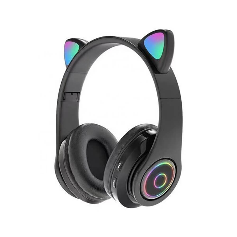 Беспроводные детские наушники с ушками Catsy, черные подключаются через Bluetooth либо стандартный кабель 3,5 мм. Они совместимы с телефонами, планшетами, компьютерами. Детские белые наушники имеют оригинальный дизайн с ушками кота, которые подсвечиваются. Есть система подавления шума для комфортного прослушивания музыки. Расстояние соединения наушников и источника звуков не должно превышать 10 метров. Наушники с кошачьими ушами оснащены микрофоном для разговоров. Возможно воспроизведение треков с карты памяти. Беспроводные наушники заряжаются от кабеля USB и могут воспроизводить музыку около 8 часов.