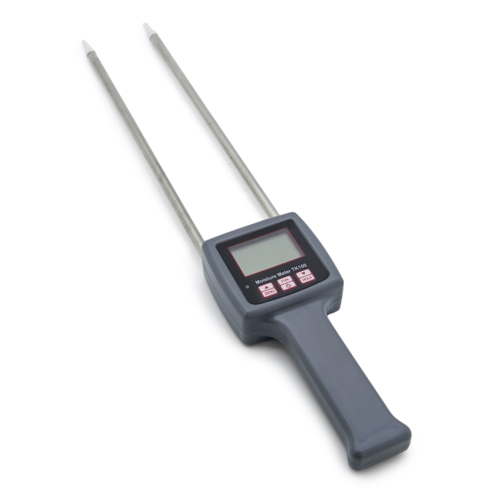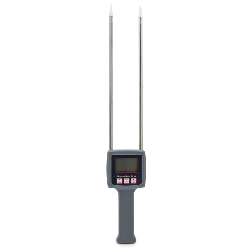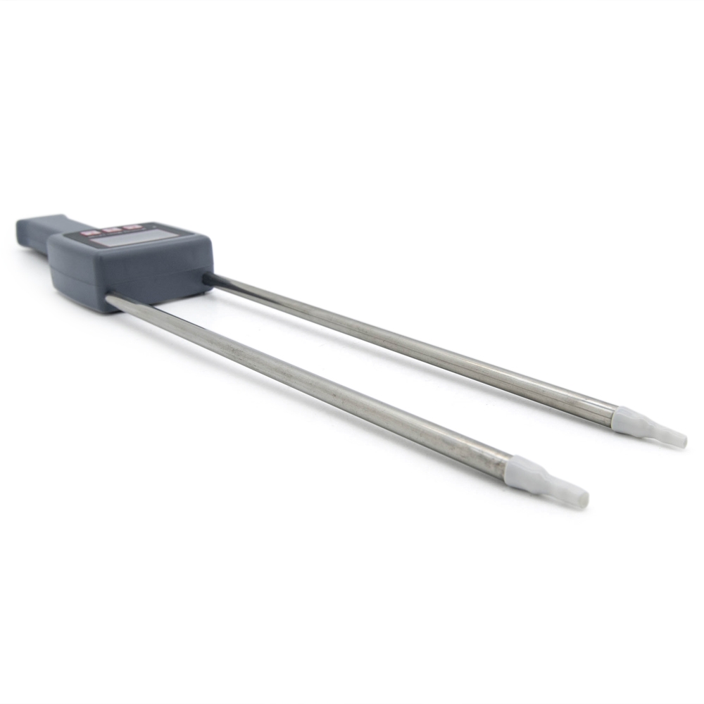 Измеритель влажности с металлическими щупами длиной 30 см. Прибор предназначен для измерения влажности зерна и сыпучих сред в интервале от 5 до 90% с точностью до 0.5%. В диапазоне температур от 0 до 60 градусов действует автоматическая температурная компенсация. Кнопка “HOLD” сохраняет на экране последнее измерение. Питается прибор от четырех батареек формата ААА. Для переноски предусмотрен удобный тканевый чехол.
