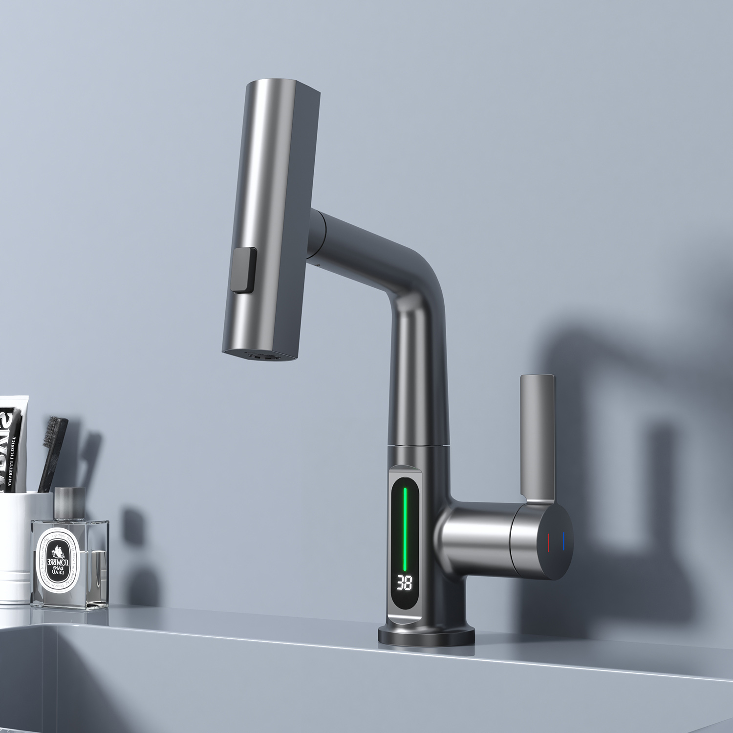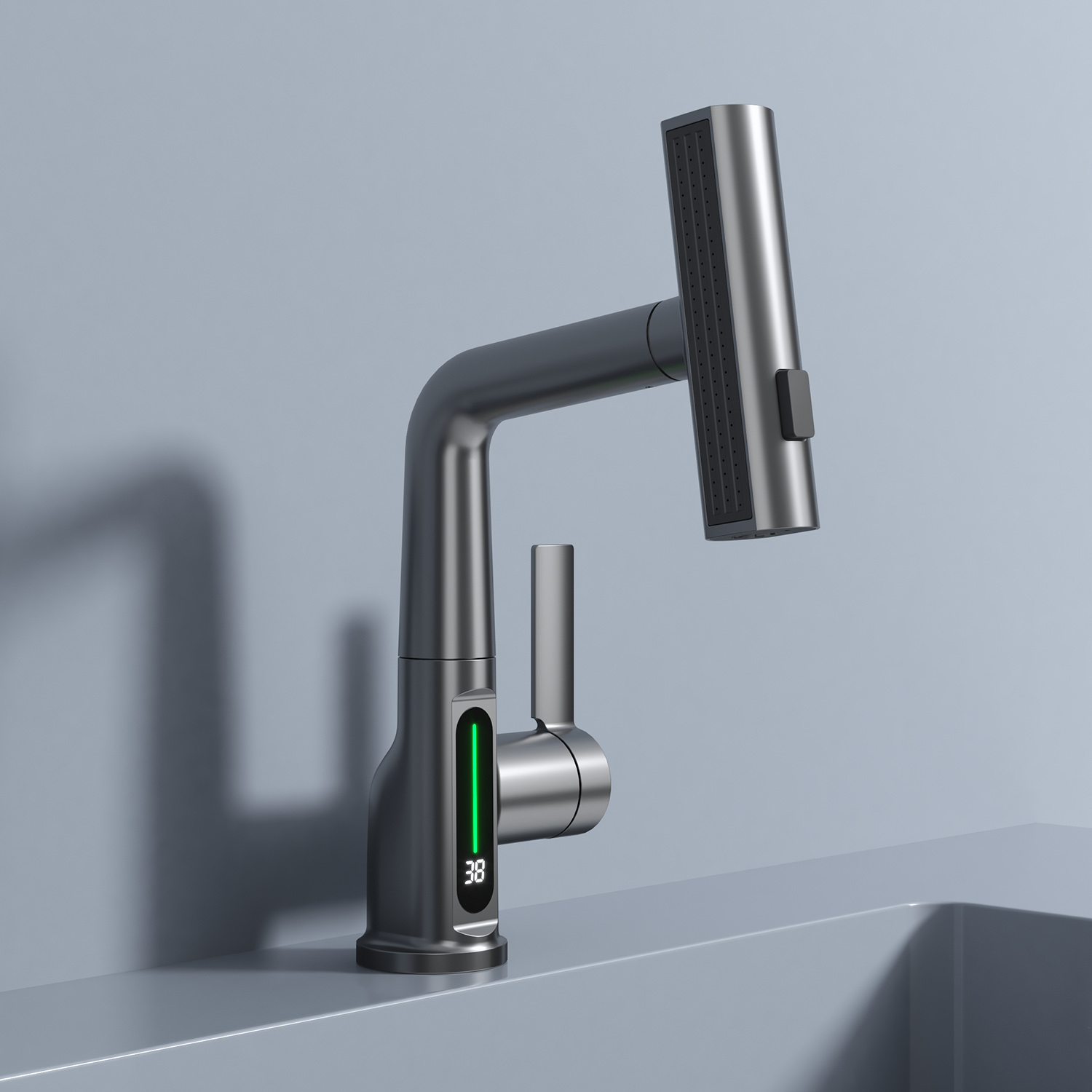 Необычная особенность этого смесителя - цветовые режимы, меняющиеся в зависимости от температуры воды: синий (0-30°С), зеленый (30-40°С), красный (40 °С и более), что делает его не только функциональным, но и стильным элементом вашей кухни.